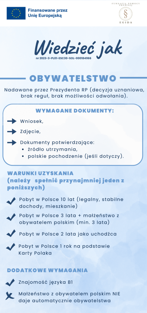 - Cudzoziemiec musi przebywać w Polsce nieprzerwanie i legalnie od co najmniej 2 lat na podstawie zezwolenia na pobyt stały, zezwolenia na pobyt rezydenta długoterminowego UE lub prawa stałego pobytu, oraz od co najmniej 3 lat być w małżeństwie z obywatelem polskim lub być bezpaństwowcem.