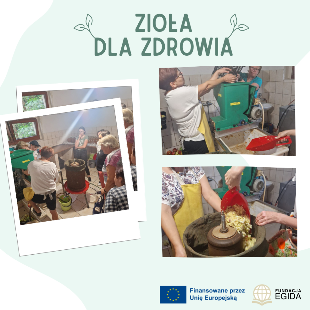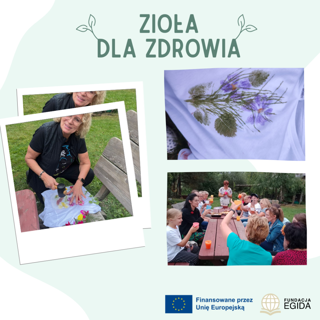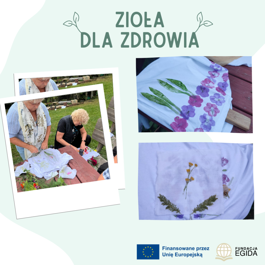 Po spacerze uczestnicy tłoczyli świeże soki z jabłek i omawiali ich wpływ na odporność i dobre samopoczucie. Degustacja była nie tylko zdrowa, ale i pełna smaku! Następnie seniorzy przystąpili do farbowania koszulek naturalnymi barwnikami i wykonywania druku roślinnego. Każda koszulka była wyjątkowa, a twórcza atmosfera wywołała wiele uśmiechów i satysfakcji.