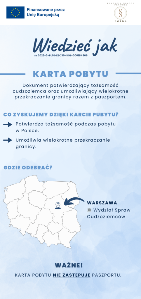 Karta pobytu potwierdza tożsamość cudzoziemca oraz uprawnia wraz z dokumentem podróży do wielokrotnego przekraczania granicy. Dane na karcie pobytu umieszcza się zgodnie z zapisami będącymi w ważnym paszporcie Cudzoziemca. Kartę pobytu odbiera się osobiście w Wydziale Spraw Cudzoziemców w Warszawie.