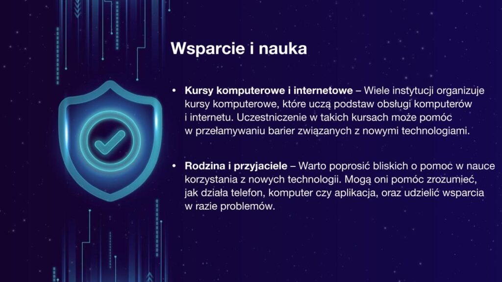 Szczególną uwagę poświęciliśmy zasadom bezpiecznego korzystania z Internetu. Uczestnicy dowiedzieli się, jak chronić swoje dane osobowe, na co zwracać uwagę podczas korzystania z różnych usług online oraz jak odpowiednio zabezpieczać swoje urządzenia – komputery, smartfony i tablety.
