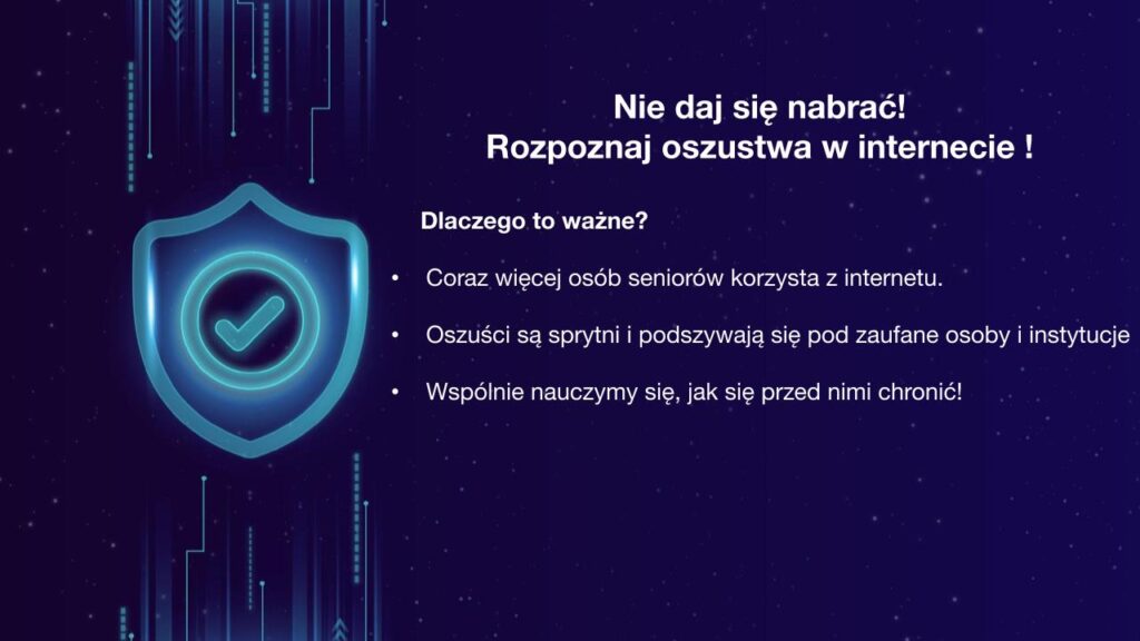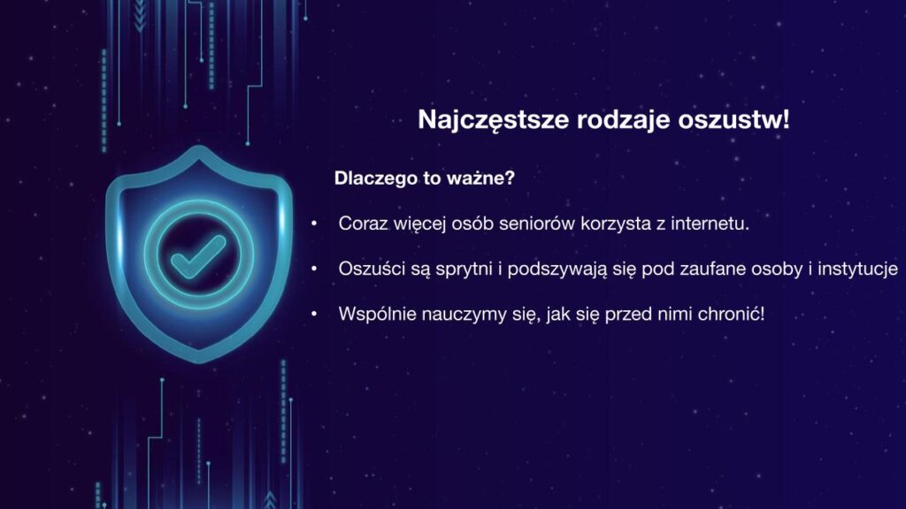 Omówiliśmy najczęstsze rodzaje oszustw, z jakimi można spotkać się w sieci. Wśród nich znalazły się m.in. fałszywe wiadomości e-mail i SMS, próby wyłudzania danych osobowych lub bankowych, podszywanie się pod instytucje, a także oszustwa związane z fałszywymi sklepami internetowymi i ogłoszeniami. Dużo uwagi poświęciliśmy również temu, jak rozpoznać fałszywego e-maila. Uczestnicy dowiedzieli się, na jakie elementy zwracać szczególną uwagę – podejrzany nadawca, błędy językowe, presja czasu czy niebezpieczne linki i załączniki. Rozmawialiśmy również o fałszywych telefonach, czyli rozmowach, w których oszuści podszywają się np. pod pracowników banku, urzędów lub członków rodziny. Wyjaśniliśmy, jak działają takie schematy i dlaczego nigdy nie należy podawać przez telefon poufnych danych ani kodów. Kolejnym ważnym zagadnieniem były zakupy w Internecie. Wskazaliśmy, na co zwracać uwagę podczas kupowania online, jak sprawdzać wiarygodność sklepów oraz jakie sygnały mogą świadczyć o próbie oszustwa.