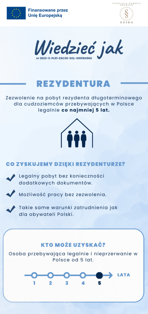 Tematem kolejnych zajęć w ramach projektu „Wiedzieć jak” nr 2023-3-PL01-ESC30-SOL-000184966 było zezwolenie na pobyt rezydenta długoterminowego. To ważny dokument, który pozwala cudzoziemcom na legalny pobyt i pracę w Polsce bez dodatkowych formalności.
